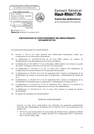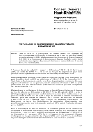Dans le cadre de la participation du Conseil Général aux dépenses de fonctionnement des médiathèques de bassins de vie, il vous est proposé d’allouer une subvention de 50 442 € à la Communauté de Communes de Thann-Cernay et de 8 420 € à la Communauté de Communes du Pays de Rouffach, au titre de la participation aux dépenses du personnel statutaire de leur médiathèque de bassin de vie pour l’exercice 2013.