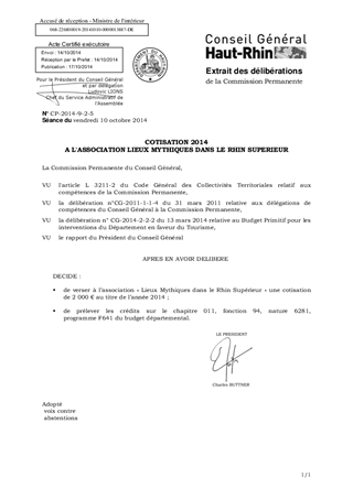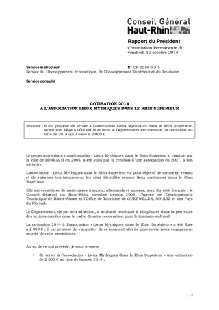 Il est proposé de verser à l'association Lieux Mythiques dans le Rhin Supérieur, ayant son siège à LÖRRACH et dont le Département est membre, la cotisation au titre de 2014 qui s'élève à 2 000 €.