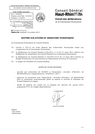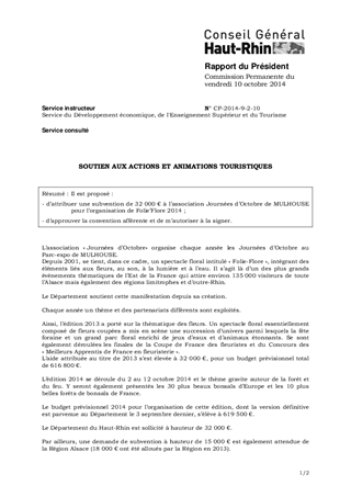 Il est proposé : - d’attribuer une subvention de 32 000 € à l’association Journées d’Octobre de MULHOUSE pour l’organisation de Folie’Flore 2014 ; - d’approuver la convention afférente et de m’autoriser à la signer.