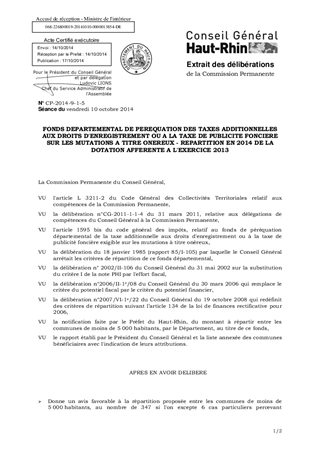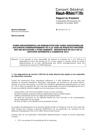 FONDS DEPARTEMENTAL DE PEREQUATION DES TAXES ADDITIONNELLES AUX DROITS D'ENREGISTREMENT OU A LA TAXE DE PUBLICITE FONCIERE SUR LES MUTATIONS A TITRE ONEREUX - REPARTITION EN 2014 DE LA DOTATION AFFERENTE A L'EXERCICE 2013