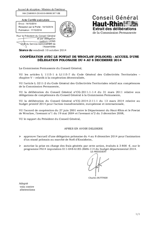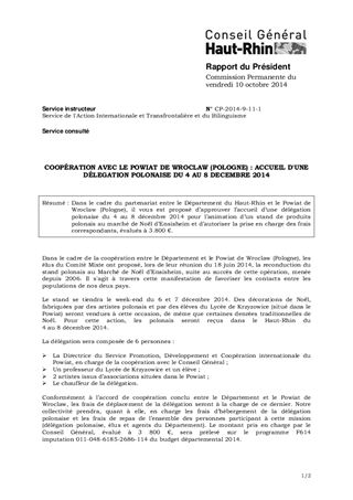 Dans le cadre du partenariat entre le Département du Haut-Rhin et le Powiat de Wroclaw (Pologne), il vous est proposé d’approuver l’accueil d’une délégation polonaise du 4 au 8 décembre 2014 pour l’animation d’un stand de produits polonais au marché de Noël d’Ensisheim et d’autoriser la prise en charge des frais correspondants, évalués à 3.800 €.