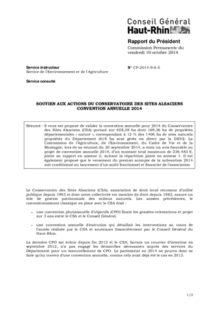 Il vous est proposé de valider la convention annuelle pour 2014 du Conservatoire des Sites Alsaciens (CSA) portant sur 658,38 ha dont 169,36 ha de propriétés départementales « nature », correspondant à 12 % des 1406 ha de sites naturels propriétés du Département (618 ha sont gérés en direct par la DEVI). La Commission de l’Agriculture, de l’Environnement, du Cadre de Vie et de la Montagne, lors de sa réunion du 30 septembre 2014, a émis un avis favorable au projet de convention annuelle 2014, d’un montant total maximum de 236 483 €, jointe au rapport en annexe 2, suivant la répartition jointe en annexe 1. Il est également proposé que le versement du premier acompte de la subvention 2014 soit conditionné au lancement d’un audit fonctionnel et financier de l’association.
