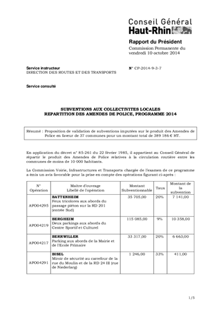 SUBVENTIONS AUX COLLECTIVITES LOCALES REPARTITION DES AMENDES DE POLICE, PROGRAMME 2014