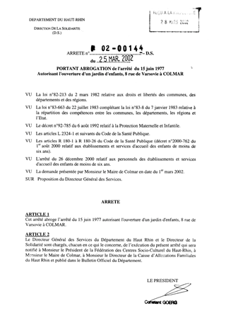 portant ABROGATION de l'arrêté du 15 juin 1977 autorisant l'ouverture d'un jardin d'enfants, 8 rue de Varsovie à Colmar Resumé Pièces jointes ARRETE Assemblée : Non défini Date : 25/03/2002 Rapporteur : Non défini Collectivité : Conseil départemental du Haut-Rhin Direction : Non défini Service : Direction de la Solidarité Domaine : Accueil d'enfants Commission :