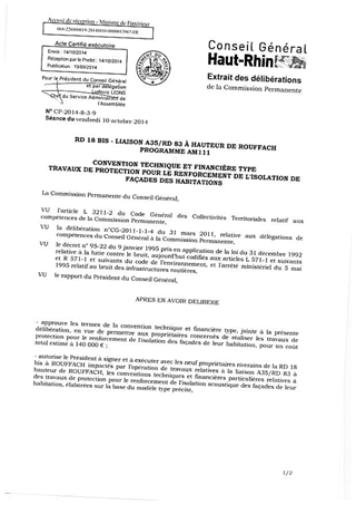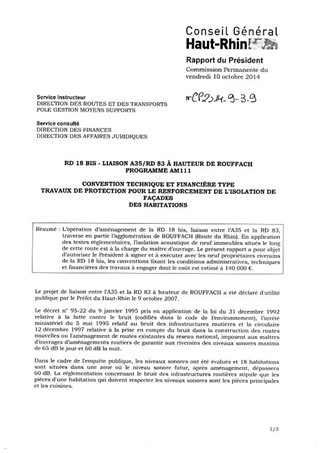 RD 18 Bis - Liaison A35/RD83 A HAUTEUR DE ROUFFACH PROGRAMME AM 111 Resumé Pièces jointes DELIBERATION RAPPORT Assemblée : Commission Permanente Date : 10/10/2014 Rapporteur : Non défini Collectivité : Conseil départemental du Haut-Rhin Direction : Non défini Service : Pôle Gestion du Domaine et Finances Domaine : Aides / Subventions Commission : Commission Permanente