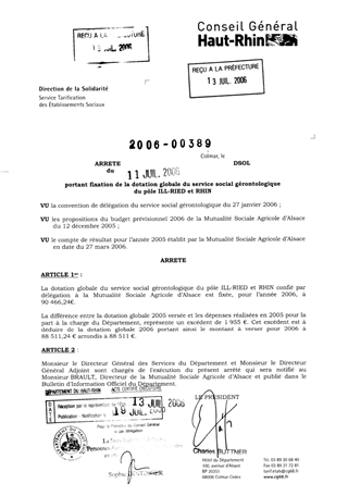 portant fixation de la dotation globale du service social gérontologique du pôle Ill-Ried et Rhin Resumé Pièces jointes ARRETE Assemblée : Non défini Date : 11/07/2006 Rapporteur : Non défini Collectivité : Conseil départemental du Haut-Rhin Direction : Non défini Service : Service de la Tarification des Etablissements Domaine : Dotations financières Commission :
