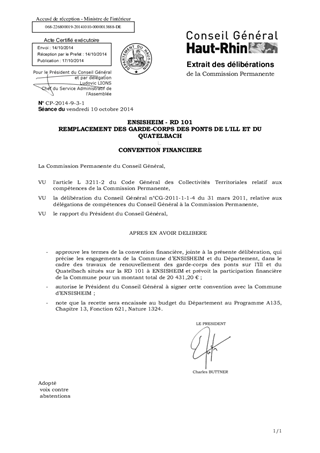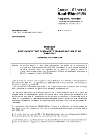 ENSISHEIM RD 101 REMPLACEMENT DES GARDE-CORPS DES PONTS DE L'ILL ET DU QUATELBACH CONVENTION FINANCIERE
