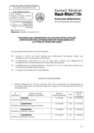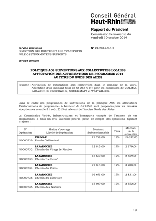 Attribution de subventions aux collectivités dans le domaine de la voirie. Affectation d'un montant total de 64 255 € HT pour les communes de COLMAR, LABAROCHE, ORSCHWIHR, SOULTZMATT et WATTWILLER.