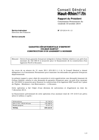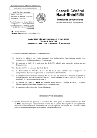 GARANTIE DÉPARTEMENTALE D'EMPRUNT COLMAR HABITAT CONSTRUCTION D'UN LOGEMENT À HOUSSEN