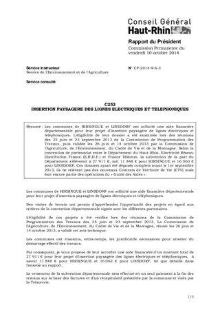 Les communes de HIRSINGUE et LINSDORF ont sollicité une aide financière départementale pour leur projet d’insertion paysagère de lignes électriques et téléphoniques. L’éligibilité de leur dossier a été examinée lors des réunions des 25 juin et 23 septembre 2013 de la Commission de Programmation des Travaux, puis validée les 26 juin et 14 octobre 2013 par la Commission de l’Agriculture, de l’Environnement, du Cadre de Vie et de la Montagne. Selon la convention de partenariat entre le Département du Haut-Rhin, Electricité Réseau Distribution France (E.R.D.F.) et France Télécom, la subvention de la part du Département s’élèverait à 27 911 €, soit 11 848 € pour HIRSINGUE et 16 063 € pour LINSDORF. Ces dossiers ayant été déposés complets avant le 1er septembre 2013, ils ne relèvent pas des nouveaux Contrats de Territoire de Vie (CTV) mais font encore partie des opérations du « Guide des Aides ».