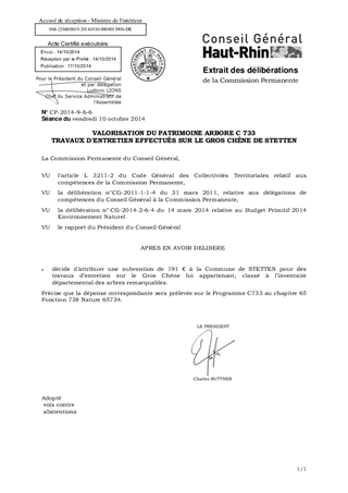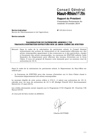 Dans le cadre de la valorisation du patrimoine arboré, le Conseil Général subventionne des actions de restauration et de conservation effectuées sur des arbres remarquables appartenant à des communes ou à des particuliers, classés à l’inventaire des arbres remarquables. La commune de STETTEN sollicite l’aide financière du Département pour effectuer des travaux d’entretien sur le Gros Chêne. Il vous est proposé de financer cette demande pour un montant total de subvention de 191 €.