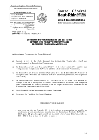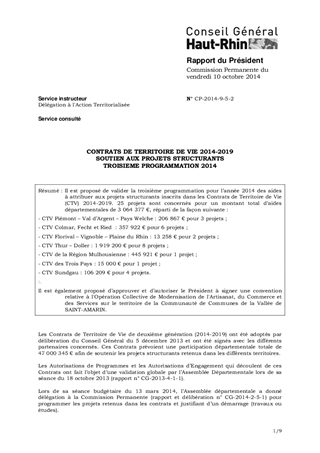 Il est proposé de valider la troisième programmation pour l’année 2014 des aides à attribuer aux projets structurants inscrits dans les Contrats de Territoire de Vie (CTV) 2014-2019. 25 projets sont concernés pour un montant total d’aides départementales de 3 064 377 €, réparti de la façon suivante : - CTV Piémont – Val d’Argent – Pays Welche : 206 867 € pour 3 projets ; - CTV Colmar, Fecht et Ried : 357 922 € pour 6 projets ; - CTV Florival – Vignoble – Plaine du Rhin : 13 258 € pour 2 projets ; - CTV Thur – Doller : 1 919 200 € pour 8 projets ; - CTV de la Région Mulhousienne : 445 921 € pour 1 projet ; - CTV des Trois Pays : 15 000 € pour 1 projet ; - CTV Sundgau : 106 209 € pour 4 projets. Il est également proposé d’approuver et d’autoriser le Président à signer une convention relative à l'Opération Collective de Modernisation de l'Artisanat, du Commerce et des Services sur le territoire de la Communauté de Communes de la Vallée de SAINT-AMARIN.
