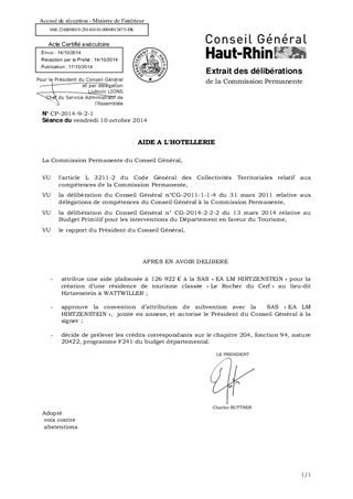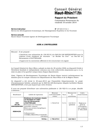 Il est proposé : - d'attribuer une subvention de 126 922 € à la SAS EA LM HIRTZENSTEIN pour la création d'une résidence de tourisme " Le Rocher du Cerf " au lieu-dit Le Hirtzenstein à WATTWILLER, - d'approuver la convention afférente et de m'autoriser à la signer.