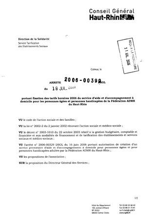 portant fixation des tarifs horaires 2006 du service d'aide et d'accompagnement à domicile pour les personnes âgées et personnes handicapées de la Fédération ADMR du Haut-Rhin Resumé Pièces jointes ARRETE Assemblée : Non défini Date : 18/07/2006 Rapporteur : Non défini Collectivité : Conseil départemental du Haut-Rhin Direction : Non défini Service : Service de la Tarification des Etablissements Domaine : Autres (non classés) Commission :
