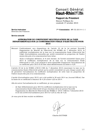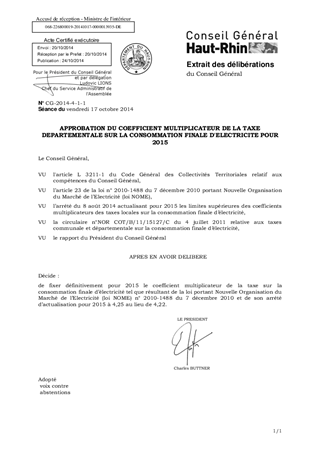 Conformément aux dispositions de l’article 23 de la loi portant Nouvelle Organisation du Marché de l’Electricité (loi NOME) du 7 décembre 2010, le coefficient multiplicateur de la taxe sur la consommation finale d’électricité fait l’objet d’actualisations annuelles par arrêté ministériel en proportion de l’indice moyen des prix à la consommation hors tabac. Suite à l’adoption définitive, le 8 août dernier, de l’arrêté ministériel fixant pour 2015 le coefficient multiplicateur de la taxe sur la consommation finale d’électricité à 4,25, il est proposé à notre Assemblée d’approuver l’actualisation de ce coefficient pour 2015 et de fixer ainsi définitivement sa limite à 4,25.