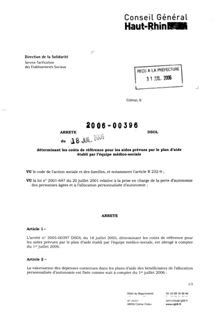 déterminant les coûts de référence pour les aides prévues par le plan d'aide établi par l'équipe médico-sociale Resumé Pièces jointes ARRETE Assemblée : Non défini Date : 18/07/2006 Rapporteur : Non défini Collectivité : Conseil départemental du Haut-Rhin Direction : Non défini Service : Service de la Tarification des Etablissements Domaine : Autres (non classés) Commission :