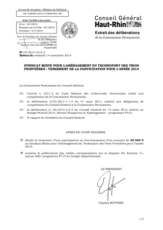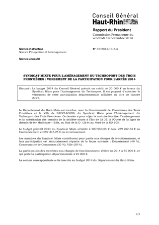 SYNDICAT MIXTE POUR L'AMÉNAGEMENT DU TECHNOPORT DES TROIS FRONTIÈRES : VERSEMENT DE LA PARTICIPATION POUR L'ANNÉE 2014