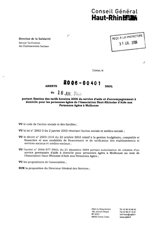 portant fixation des tarifs horaires 2006 du service d'aide et d'accompagnement à domicile pour les personnes âgées de l'Association Haut-Rhinoise d'Aide aux Personnes Agées à Mulhouse Resumé Pièces jointes ARRETE Assemblée : Non défini Date : 18/07/2006 Rapporteur : Non défini Collectivité : Conseil départemental du Haut-Rhin Direction : Non défini Service : Service de la Tarification des Etablissements Domaine : Personnes Agées Commission :