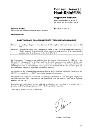 Les collèges disposent actuellement de 38 emplois aidés soit l'équivalent de 19 ETP. Le rapport propose de verser, aux collèges concernés, la part employeur des contrats aidés, relatifs aux fonctions d’accueil, d’entretien, d’hébergement et de restauration.Le montant total de la dépense s’élève à 65 196,48 €.
