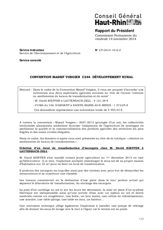 Dans le cadre de la Convention Massif Vosgien, il vous est proposé d’accorder une subvention aux deux exploitants agricoles suivants au titre de l’action "création ou amélioration de locaux de transformation et de vente" : - M. David KIEFFER à LAUTENBACH-ZELL : 4 121,38 € - CUMA du VAL D’ARGENT à SAINTE-MARIE-AUX-MINES : 1 372,05 € Ces demandent représentent une subvention totale de 5 493,43 €.