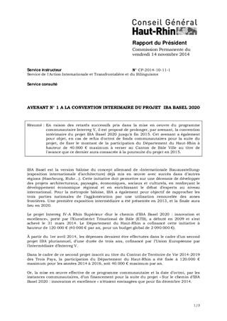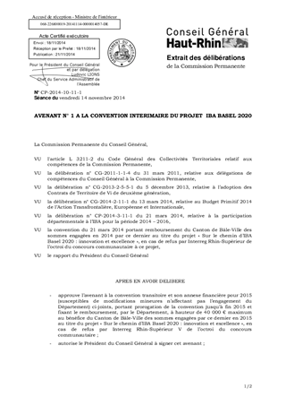 En raison des retards successifs pris dans la mise en oeuvre du programme communautaire Interreg V, il est proposé de prolonger, par avenant, la convention intérimaire du projet IBA Basel 2020 jusqu'à fin 2015. Cet avenant a également pour objet, en cas de refus d'octroi de fonds communautaires pour la suite du projet, de fixer le montant de la participation du Département du Haut-Rhin à hauteur de 40.000 € maximum à verser au Canton de Bâle Ville au titre de l'avance que ce dernier aura consacrée à la poursuite du projet en 2015.