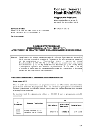 Dans le cadre du présent rapport et selon le règlement financier dans son article 9.6, il vous est proposé de procéder à l’ajustement des affectations par opération sur les programmes A111 "Constructions neuves et travaux sur routes départementales" (- 301 601 €), A131 "Travaux de renforcement sur routes départementales" (- 79 701 €), A132 "Travaux de calibrage" (+ 44 148 €), A171 "Aménagement cyclable sur domaine départemental" (+ 170 000 €) et de m’autoriser à signer avec les partenaires concernés, les conventions et avenants portant sur les programmes correspondants.