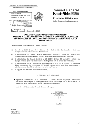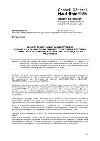 Il vous est proposé de valider l'avenant n°1 à la Convention INTERREG IV « Innovation, nouvelles technologies et développement durable touristique sur la Route Verte » destiné à prolonger de huit mois le projet. Cette prolongation n’a pas d’incidence financière pour les cofinanceurs du projet