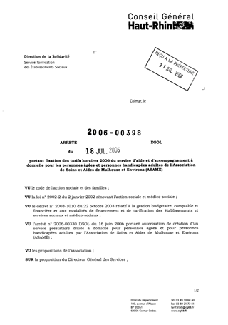 portant fixation des tarifs horaires 2006 du service d'aide et d'accompagnement à domicile pour les personnes âgées et personnes handicapées adultes de l'Association de Soins et Aides de Mulhouse et Environs Resumé Pièces jointes ARRETE Assemblée : Non défini Date : 18/07/2006 Rapporteur : Non défini Collectivité : Conseil départemental du Haut-Rhin Direction : Non défini Service : Service de la Tarification des Etablissements Domaine : Autres (non classés) Commission :
