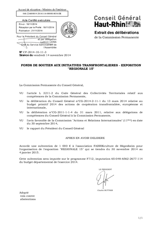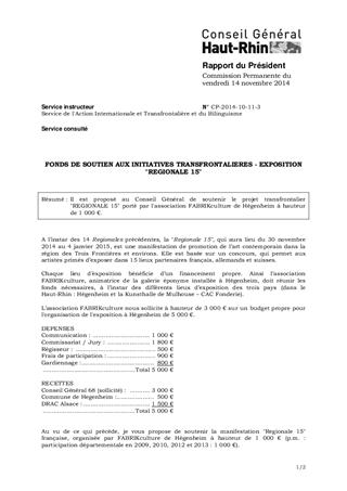 Il est proposé au Conseil Général de soutenir le projet transfrontalier "REGIONALE 15" porté par l'association FABRIKculture de Hégenheim à hauteur de 1 000 €.