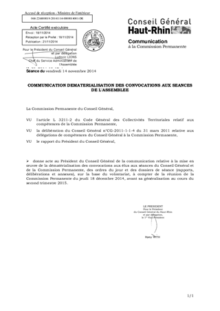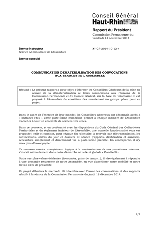 Le présent rapport a pour objet d'informer les Conseillers Généraux de la mise en oeuvre de la dématérialisation de leurs convocations aux réunions de la Commission Permanente et du Conseil Général, sur la base du volontariat. Il est proposé à l'Assemblée de constituer dès maintenant un groupe pilote pour ce projet.