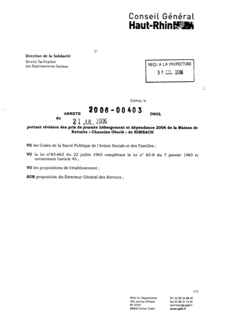 portant révision des prix de journée hébergement et dépendance 2006 de la Maison de Retraite "Chanoine Oberlé" de Rimbach Resumé Pièces jointes ARRETE Assemblée : Non défini Date : 21/07/2006 Rapporteur : Non défini Collectivité : Conseil départemental du Haut-Rhin Direction : Non défini Service : Service de la Tarification des Etablissements Domaine : Prix de Journée Commission :