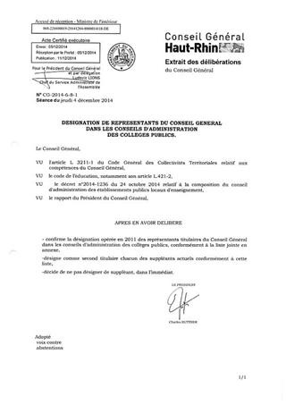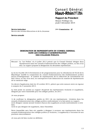 La "Loi Peillon" du 8 juillet 2013 prévoit que le Conseil Général désigne deux représentants dans les conseils d'administration des collèges publics, au lieu d'un seul. Le rapport propose la désignation du deuxième représentant.
