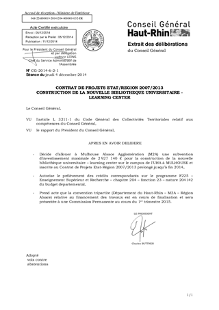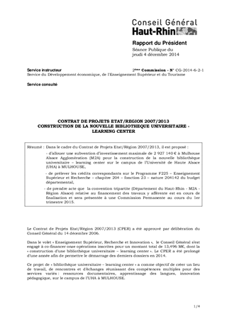 Dans le cadre du Contrat de Projets Etat/Région 2007/2013, il est proposé : - d’allouer une subvention d’investissement maximale de 2 927 140 € à Mulhouse Alsace Agglomération (M2A) pour la construction de la nouvelle bibliothèque universitaire – learning center sur le campus de l’Université de Haute Alsace (UHA) à MULHOUSE, - de prélever les crédits correspondants sur le Programme F225 – Enseignement Supérieur et Recherche – chapitre 204 – fonction 23 – nature 204142 du budget départemental, - de prendre acte que la convention tripartite (Département du Haut-Rhin - M2A - Région Alsace) relative au financement des travaux y afférente est en cours de finalisation et sera présentée à une Commission Permanente au cours du 1er trimestre 2015.