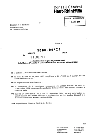 portant fixation du prix de journée 2006 de la Maison d'enfants et accueil familial "La Nichée" à Algolsheim Resumé Pièces jointes ARRETE Assemblée : Non défini Date : 31/07/2006 Rapporteur : Non défini Collectivité : Conseil départemental du Haut-Rhin Direction : Non défini Service : Service de la Tarification des Etablissements Domaine : Prix de Journée Commission :