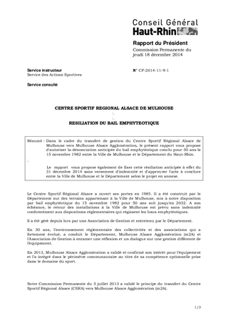 Dans le cadre du transfert de gestion du Centre Sportif Régional Alsace de Mulhouse vers Mulhouse Alsace Agglomération, le présent rapport vous propose d'autoriser la dénonciation anticipée du bail emphytéotique conclu pour 50 ans le 15 novembre 1982 entre la Ville de Mulhouse et le Département du Haut-Rhin. Le rapport vous propose également de fixer cette résiliation anticipée à effet du 31 décembre 2014 sans versement d'indemnité et d'approuver l'acte à conclure entre la Ville de Mulhouse et le Département selon le projet en annexe.