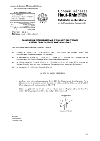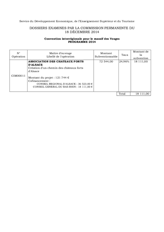 Il vous est proposé d’accorder une subvention de 18 111 € à l’Association des Châteaux Forts d’Alsace pour la réalisation du Chemin des châteaux forts d’Alsace, projet structurant soutenu au titre de la Convention Interrégionale du Massif des Vosges.