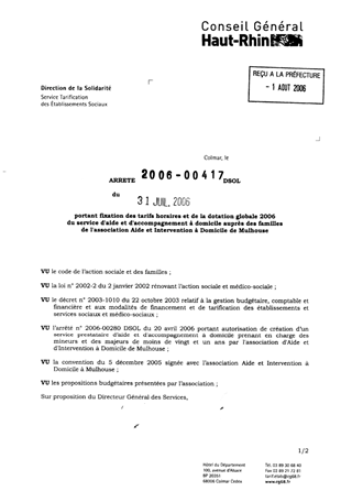portant fixation des tarifs horaires et de la dotation globale 2006 du service d'aide et d'accompagnement à domicile auprès des familles de l'association Aide et Intervention à Domicile de Mulhouse Resumé Pièces jointes ARRETE Assemblée : Non défini Date : 31/07/2006 Rapporteur : Non défini Collectivité : Conseil départemental du Haut-Rhin Direction : Non défini Service : Service de la Tarification des Etablissements Domaine : Dotations financières Commission :