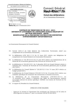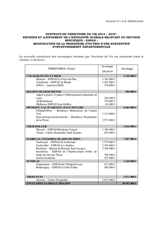 Il vous est proposé dans le cadre des Contrats de Territoire de Vie, dits de « deuxième génération » pour la période 2014-2019 : - de réviser le montant de l’enveloppe par territoire pour les projets relevant du secteur spécifique « EHPAD » s’élevant à 20 582 000 € suite à l’abondement de 420 000 € d’autorisations de programme votées en DM2 2014, - d’ajuster la programmation à l’évolution des projets au regard des derniers éléments opérationnels intervenus depuis l’adoption de cette enveloppe. Par ailleurs, il est proposé d’apporter une modification à la procédure d’octroi d’une subvention départementale aux EHPAD et accueils de jour personnes âgées en remplaçant la réalisation de l'étude de diagnostic par la réalisation d'une étude préalable d'intention plus globale.