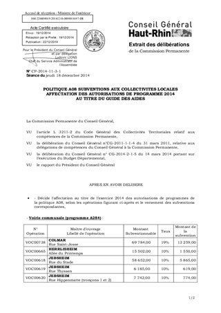 POLITIQUE A08 SUBVENTIONS AUX COLLECTIVITES LOCALES AFFECTATION DES AUTORISATIONS DE PROGRAMME 2014 AU TITRE DU GUIDE DES AIDES