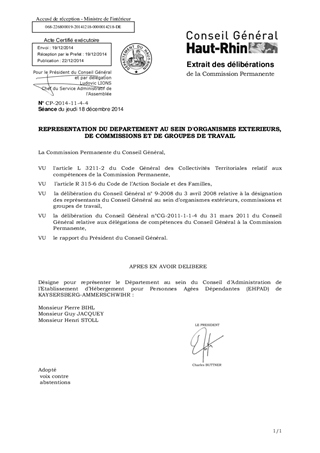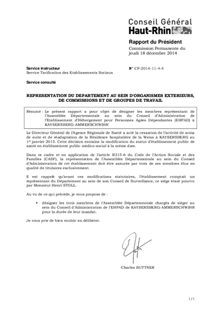 Le présent rapport a pour objet de désigner les membres représentant de l’Assemblée Départementale au sein du Conseil d’Administration de l’Etablissement d’Hébergement pour Personnes Agées Dépendantes (EHPAD) à KAYSERSBERG-AMMERSCHWIHR