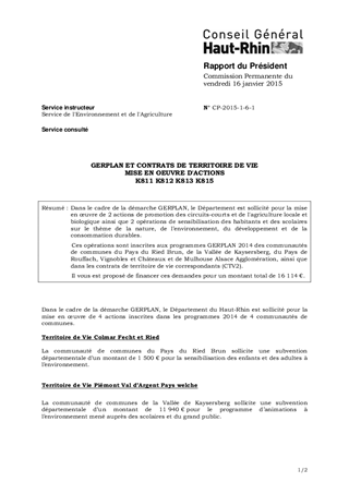 Dans le cadre de la démarche GERPLAN, le Département est sollicité pour la mise en œuvre de 2 actions de promotion des circuits-courts et de l'agriculture locale et biologique ainsi que 2 opérations de sensibilisation des habitants et des scolaires sur le thème de la nature, de l’environnement, du développement et de la consommation durables. Ces opérations sont inscrites aux programmes GERPLAN 2014 des communautés de communes du Pays du Ried Brun, de la Vallée de Kaysersberg, du Pays de Rouffach, Vignobles et Châteaux et de Mulhouse Alsace Agglomération, ainsi que dans les contrats de territoire de vie correspondants (CTV2). Il vous est proposé de financer ces demandes pour un montant total de 16 114 €.