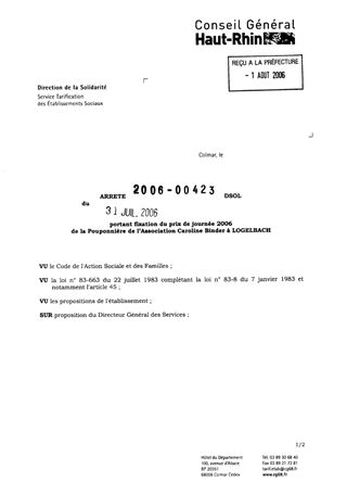 portant fixation du prix de journée 2006 de la Pouponnière de l'Association Caroline Binder à Logelbach Resumé Pièces jointes ARRETE Assemblée : Non défini Date : 31/07/2006 Rapporteur : Non défini Collectivité : Conseil départemental du Haut-Rhin Direction : Non défini Service : Service de la Tarification des Etablissements Domaine : Prix de Journée Commission :