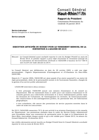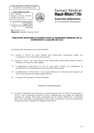 EXECUTION ANTICIPÉE DU BUDGET POUR LE VERSEMENT MENSUEL DE LA SUBVENTION À L'ADAUHR EN 2015
