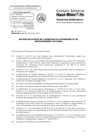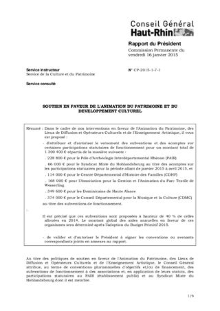 Dans le cadre de nos interventions en faveur de l’Animation du Patrimoine, des Lieux de Diffusion et Opérateurs Culturels et de l'Enseignement Artistique, il vous est proposé : - d'attribuer et d'autoriser le versement des subventions et des acomptes sur certaines participations statutaires de fonctionnement pour un montant total de 1 300 400 € répartis de la manière suivante : . 228 800 € pour le Pôle d’Archéologie Interdépartemental Rhénan (PAIR) . 66 000 € pour le Syndicat Mixte du Hohlandsbourg au titre des acomptes sur les participations statuaires pour la période allant de janvier 2015 à avril 2015, et . 114 000 € pour le Centre Départemental d’Histoire des Familles (CDHF) . 168 000 € pour l’Association pour la Gestion et l’Animation du Parc Textile de Wesserling . 349 600 € pour les Dominicains de Haute Alsace . 374 000 € pour le Conseil Départemental pour la Musique et la Culture (CDMC) au titre des subventions de fonctionnement. Il est précisé que ces subventions sont proposées à hauteur de 40 % de celles allouées en 2014. Le montant global des aides annuelles en faveur de ces organismes sera déterminé après l’adoption du Budget Primitif 2015. - de valider et d'autoriser le Président à signer les conventions ou avenants correspondants joints en annexes au rapport.
