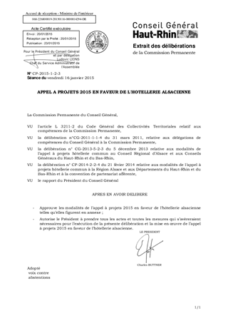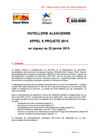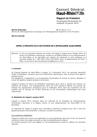 Il vous est proposé d’arrêter les termes de l’appel à projets pour l’année 2015 en faveur de l’hôtellerie alsacienne, commun à la Région Alsace et aux Départements du Haut-Rhin et du Bas-Rhin qui prévoit de consacrer à cette politique un montant global de 1 200 000 € dont 300 000 € pour le Département du Haut-Rhin, sous réserve des inscriptions budgétaires à venir.