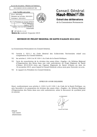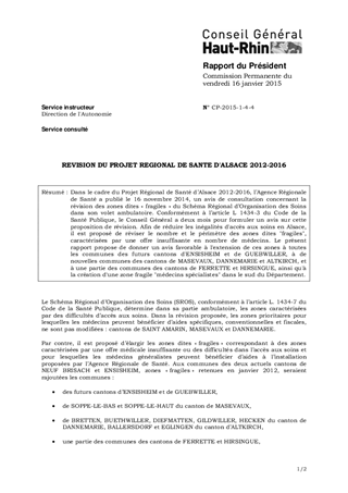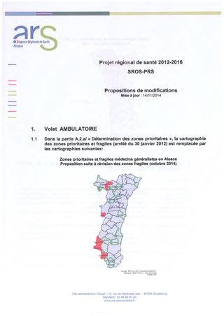 Dans le cadre du Projet Régional de Santé d’Alsace 2012-2016, l’Agence Régionale de Santé a publié le 16 novembre 2014, un avis de consultation concernant la révision des zones dites « fragiles » du Schéma Régional d’Organisation des Soins dans son volet ambulatoire. Conformément à l’article L 1434-3 du Code de la Santé Publique, le Conseil Général a deux mois pour formuler un avis sur cette proposition de révision. Afin de réduire les inégalités d'accès aux soins en Alsace, il est proposé de réviser le nombre et le périmètre des zones dites "fragiles", caractérisées par une offre insuffisante en nombre de médecins. Le présent rapport propose de donner un avis favorable à l'extension de ces zones à toutes les communes des futurs cantons d'ENSISHEIM et de GUEBWILLER, à de nouvelles communes des cantons de MASEVAUX, DANNEMARIE et ALTKIRCH, et à une partie des communes des cantons de FERRETTE et HIRSINGUE, ainsi qu'à la création d'une zone fragile "médecins spécialistes" dans le sud du Département.
