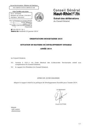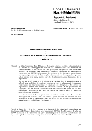 ORIENTATIONS BUDGETAIRES 2015 SITUATION EN MATIERE DE DEVELOPPEMENT DURABLE ANNÉE 2014