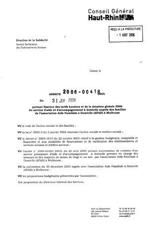portant fixation des tarifs horaires et de la dotation globale 2006 du service d'aide et d'accompagnement à domicile auprès des familles de l'association Aide Familiale à Domicile (AFAD) à Mulhouse Resumé Pièces jointes ARRETE Assemblée : Non défini Date : 31/07/2006 Rapporteur : Non défini Collectivité : Conseil départemental du Haut-Rhin Direction : Non défini Service : Service de la Tarification des Etablissements Domaine : Dotations financières Commission :