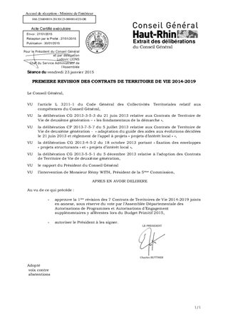 Il est soumis à l’Assemblée Départementale, pour approbation, les sept Contrats de Territoire de Vie 2014-2019 élaborés conjointement par les partenaires des territoires et le Département, dans le cadre de leur 1ère révision. Avec cette première révision, ce sont 66 744 341 € qui seront prévus pour les Contrats de Territoire de Vie, soit 19 414 182 € de plus que lors de la première élaboration. Les Autorisations de Programme et les Autorisations d’Engagement correspondantes seront approuvées dans le cadre du Budget Primitif 2015.