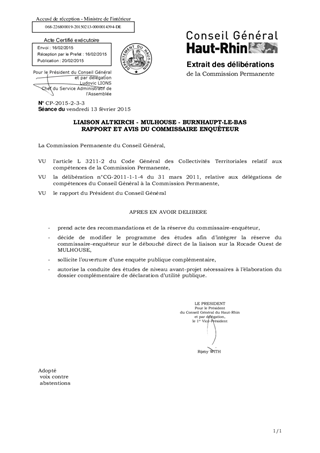 Par délibération du 5 juillet 2013, la Commission Permanente a fixé l'enveloppe financière prévisionnelle consacrée à la liaison ALTKIRCH - MULHOUSE - BURNHAUPT-LE-BAS , au montant estimé de 109 M€ TTC (valeur octobre 2011). Le présent rapport a pour objet de présenter le rapport et l'avis du commissaire enquêteur suite à l'enquête pour la déclaration d'utilité publique de cette liaison et de donner suite à celui-ci en : - prenant acte des recommandations et de la réserve du Commissaire Enquêteur, - modifiant le programme des études afin d’intégrer la réserve du commissaire-enquêteur sur le débouché direct de la liaison sur la Rocade Ouest de Mulhouse, - sollicitant l’ouverture d’une enquête publique complémentaire, - autorisant la conduite des études de niveau avant-projet nécessaires à l’élaboration du dossier complémentaire de déclaration d’utilité publique.